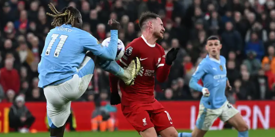 ‘Liverpool have been robbed’ – Michael Oliver accused of Man City bias after failing to award penalty for Jeremy Doku’s ‘reckless’ challenge on Alexis Mac Allister in stoppage time